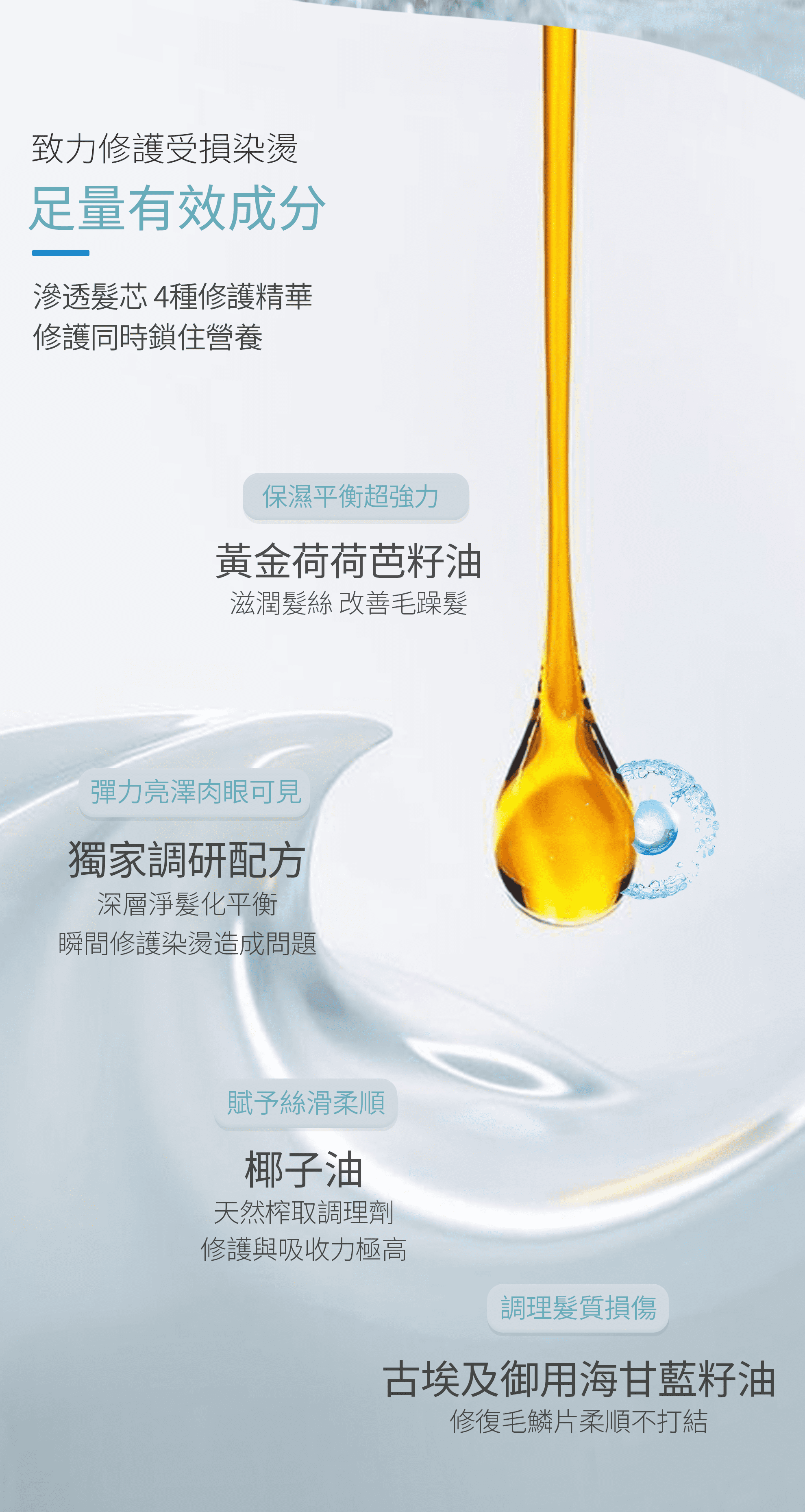 重點功效:修復毛鱗片、滋潤髮絲、改善毛躁