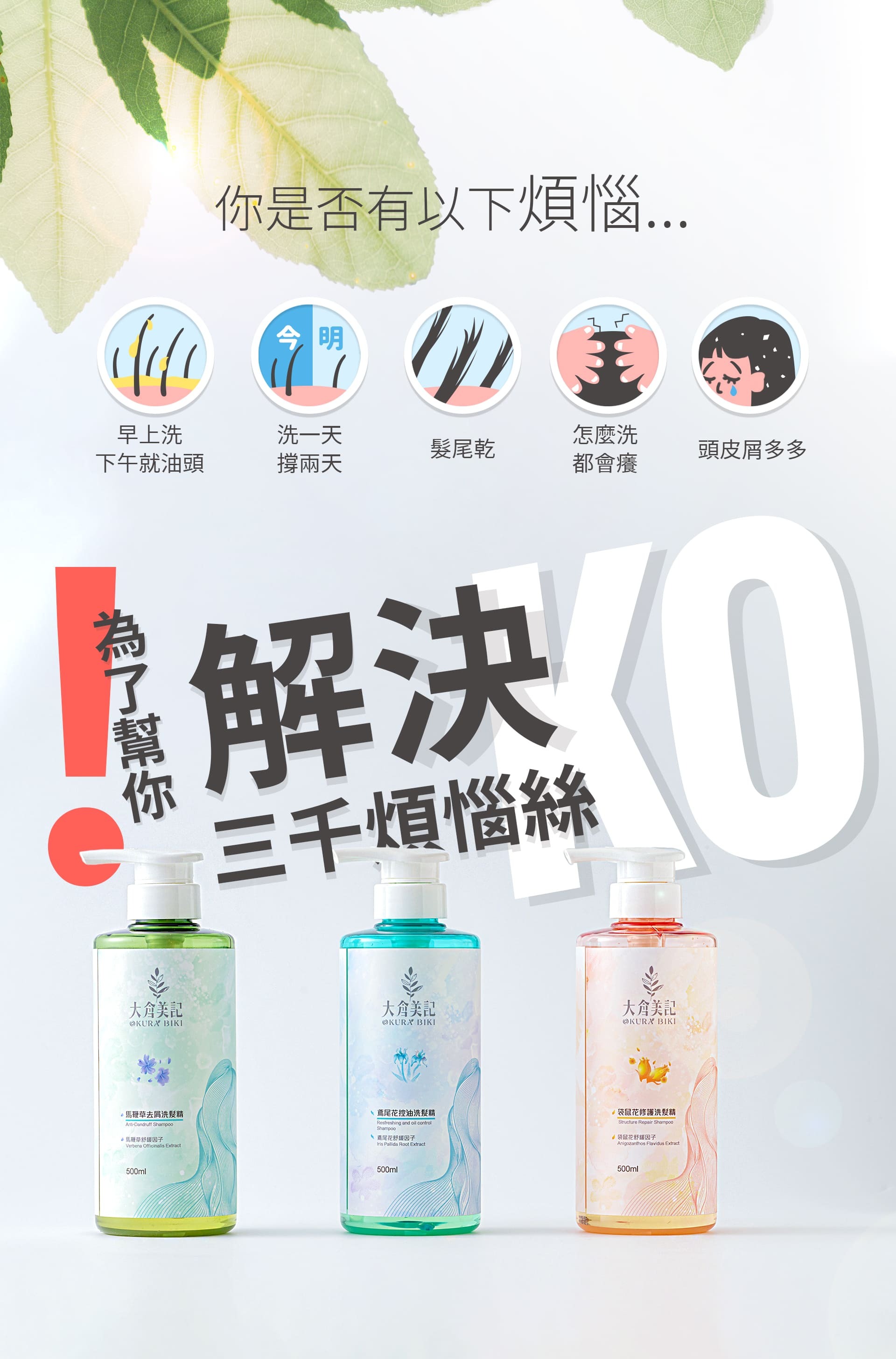 ✅3種不同功效洗髮精: 去屑、控油、修護